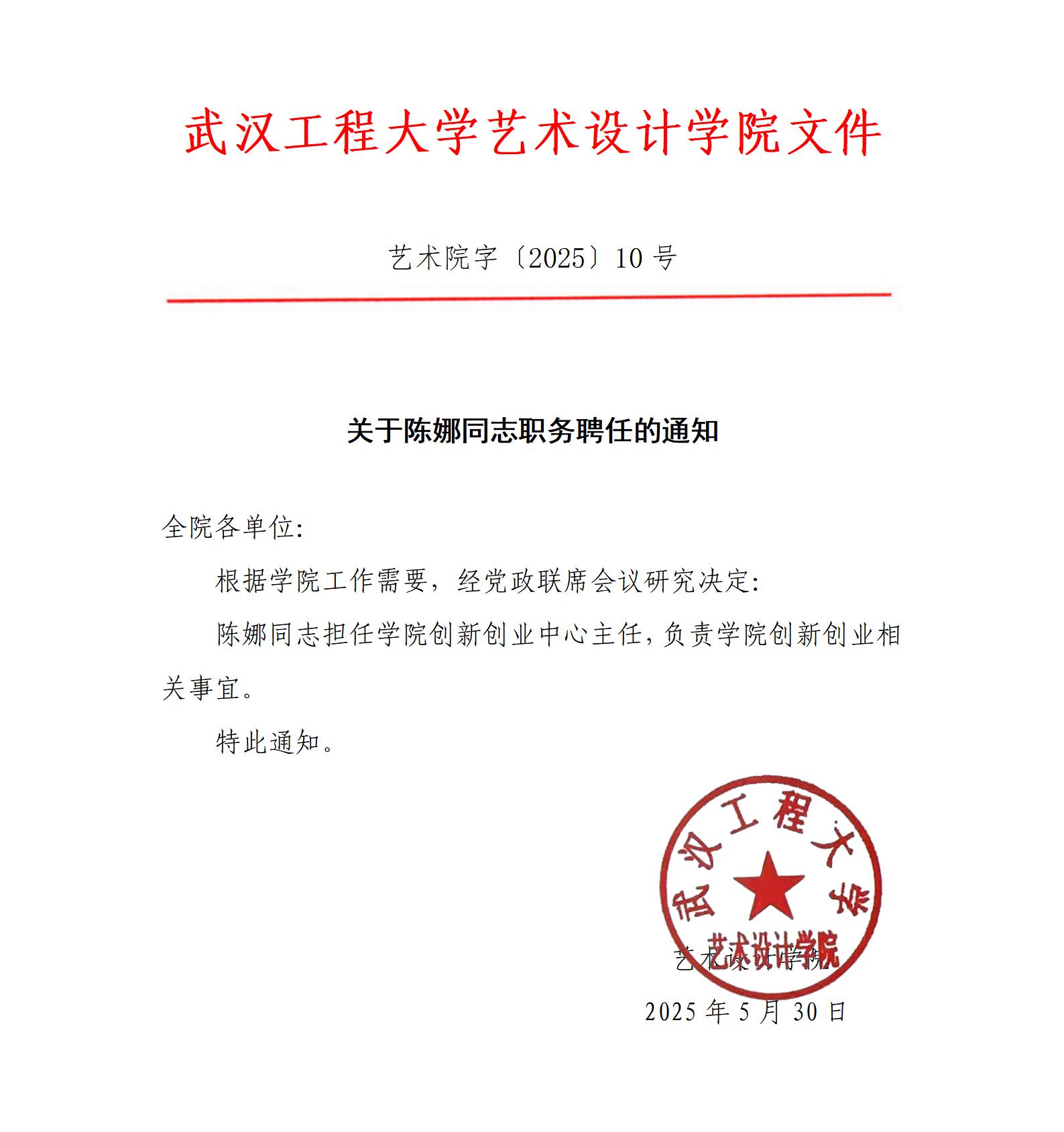 关于陈娜同志职务聘任的通知