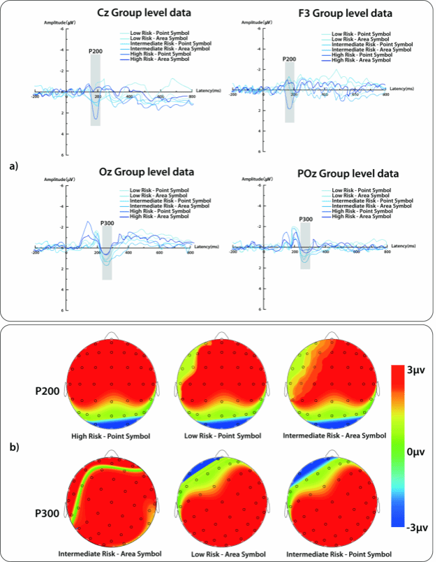 研究实验部分使用了日本京都市的地图作为底图,设计了六类不同风险等级和符号类型的疫情地图,包括点状和面状符号,以及低、中、高三种风险等级。问卷调查采用了新冠肺炎疫情风险感知量表(PRCPS),而ERP实验基于Oddball范式,考察了不同符号类型和风险等级对被试整体风险感知的影响。问卷结果分析显示,不同疫情地图的风险感知存在显著差异,高风险和中风险地图的风险感知得分显著高于低风险地图。ERP结果分析表明,符号类型和风险等级对疫情地图的早期认知加工有显著影响。点状符号疫情地图的唤醒程度更高,更能有效吸引个体的注意力;面状符号在低风险情境下有助于提升信息获取效率;高等级风险信息会吸引个体更多的注意资源。