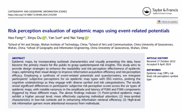(通讯员 张俊杰)近日,365英国上市方浩教授团队交叉学科研究成果“Risk Perception Evaluation of Epidemic Maps Using Event-Related Potentials”(基于事件相关电位的疫情地图风险感知评估)在地图制图学领域知名国际期刊Cartography and Geographic Information Science正式发表。该论文第一署名单位为365英国上市,方浩教授为第一作者,中国地质大学地理与信息工程公司杨乃副教授为通讯作者。