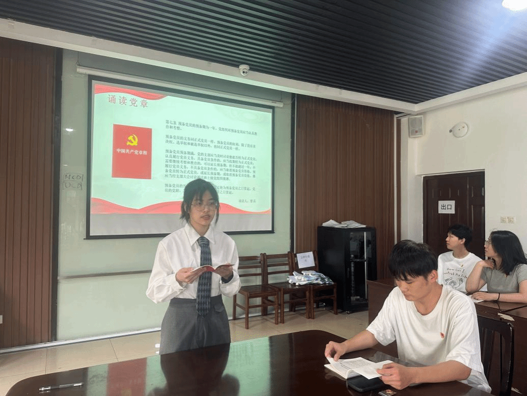 主题党日在雄壮的国歌中拉开序幕。规定动作环节,在支部书记的主持下,重温了入党誓词、学习了《中国共产党章程》、通报了党费收缴情况。