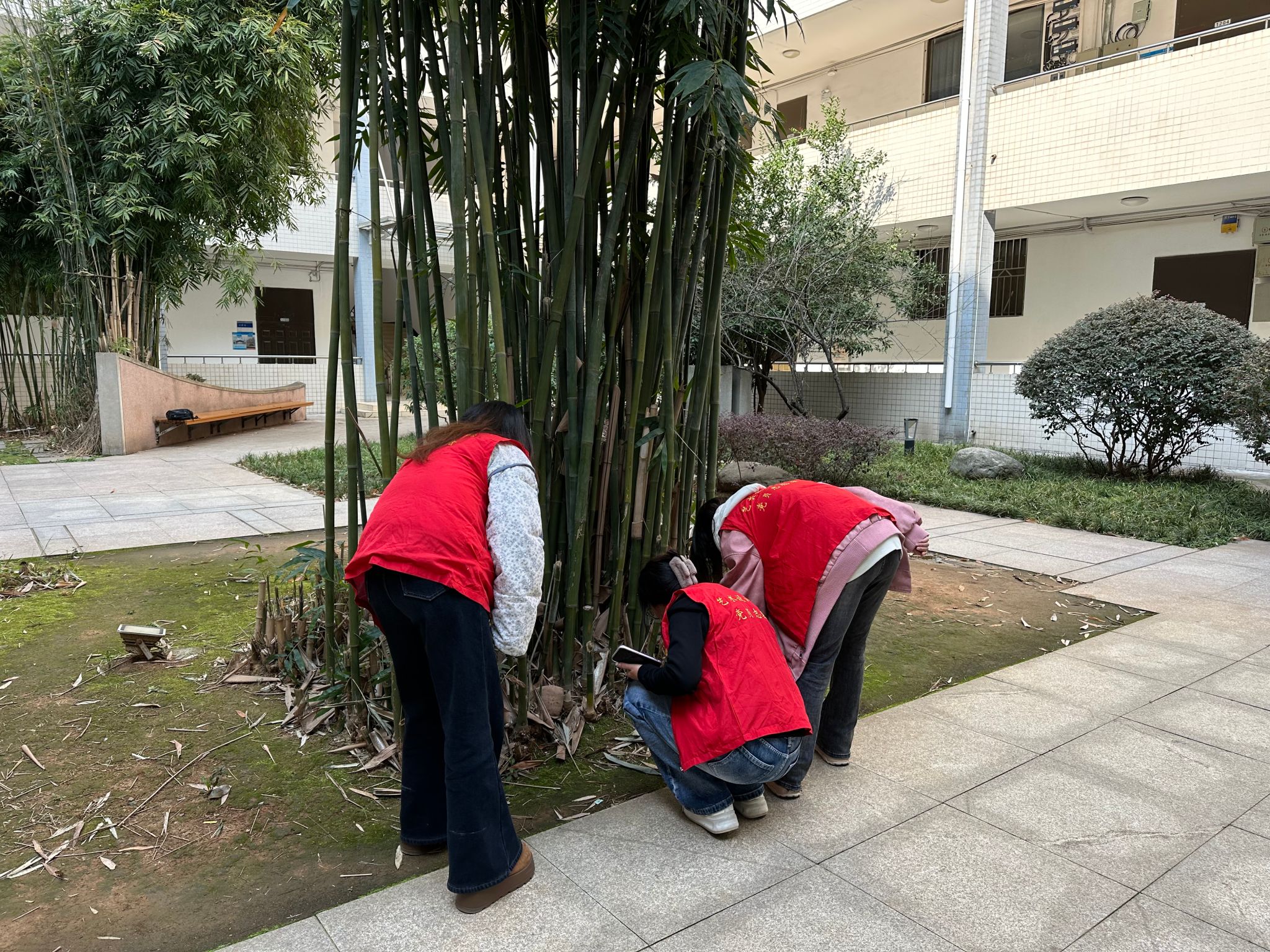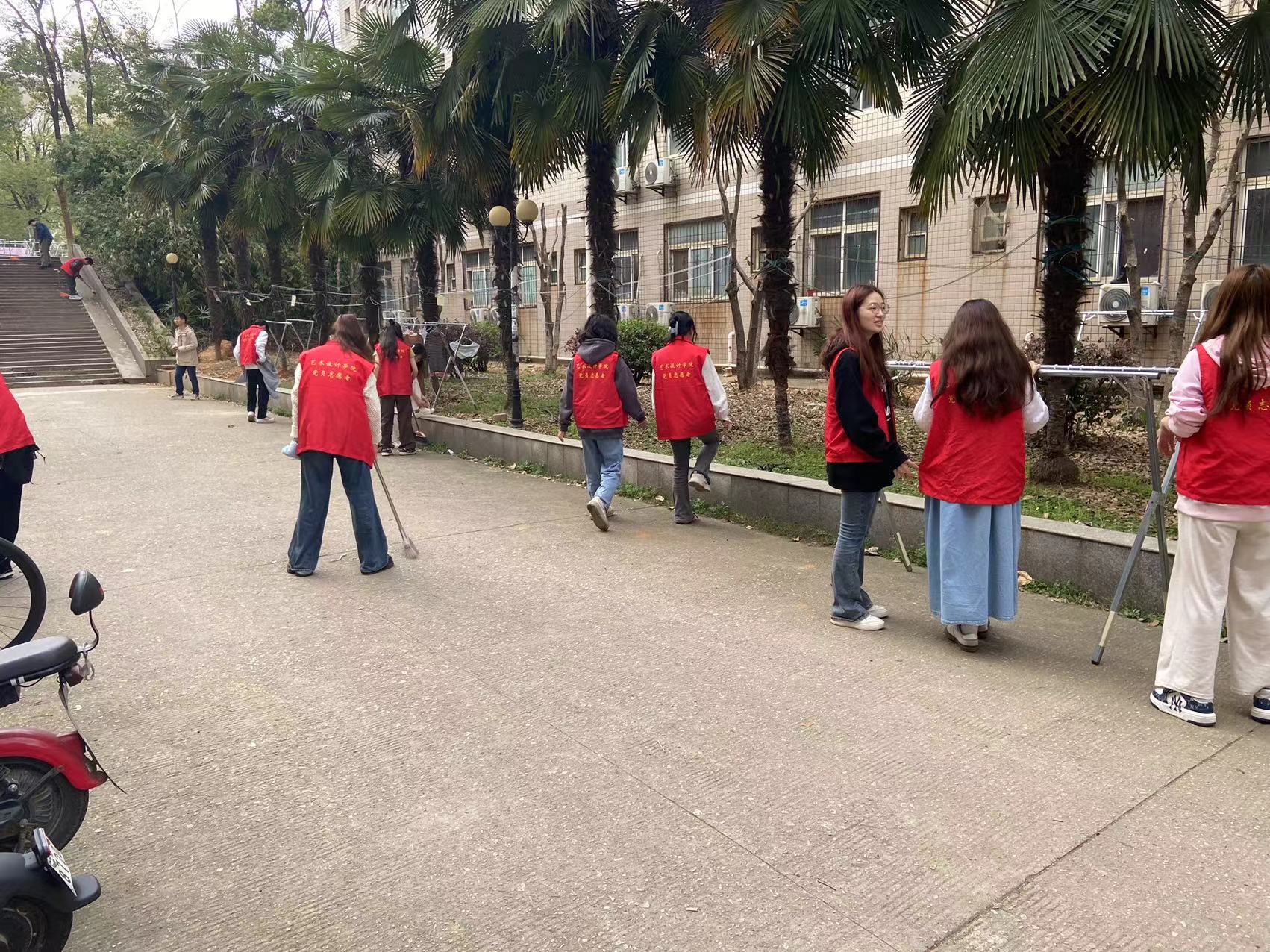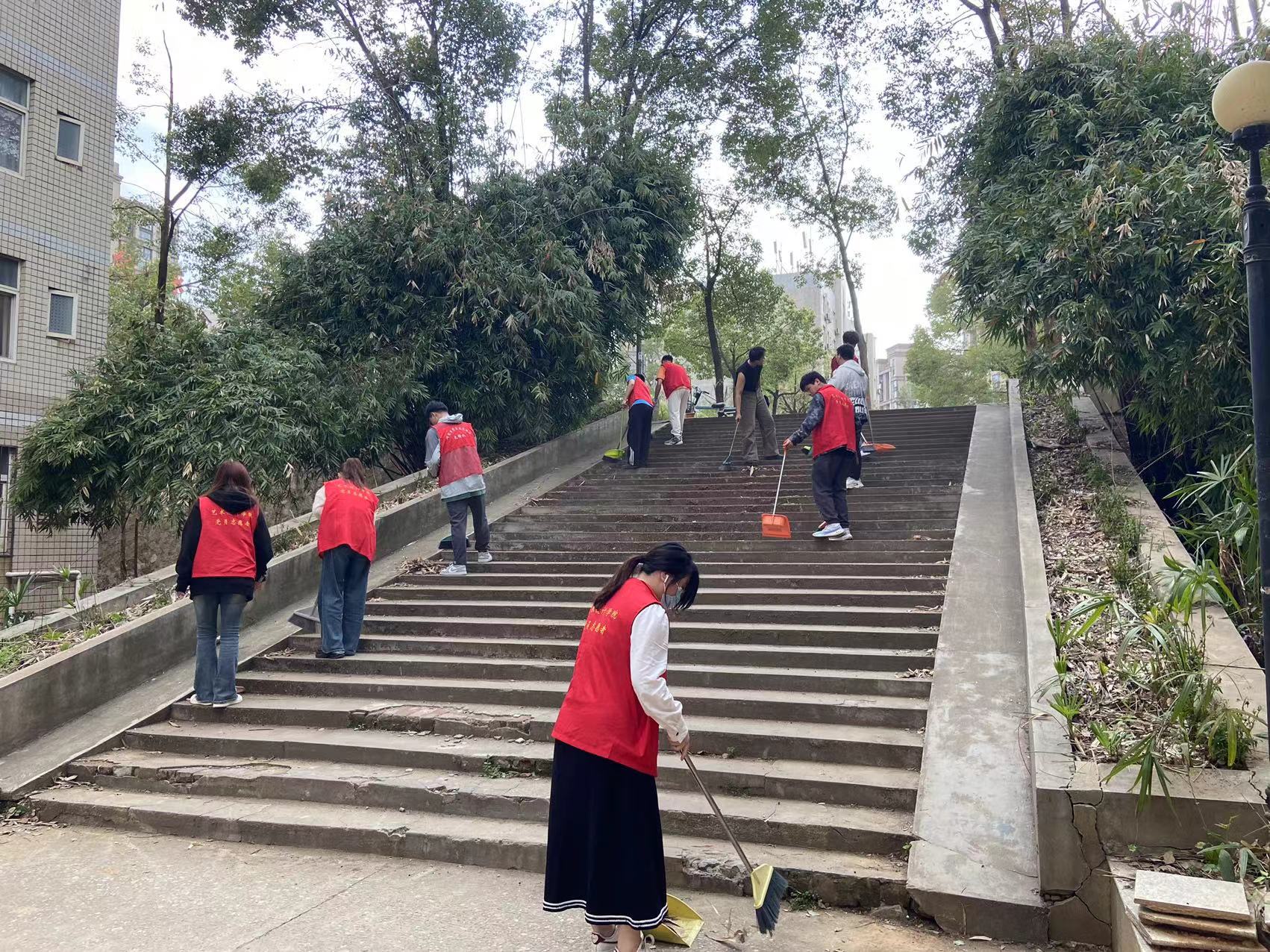 活动伊始,志愿者们身着统一服装,手持扫帚、簸箕、抹布等工具迅速集结。志愿者们手持工具,分组清扫落叶纸屑、捡拾塑料瓶罐,对泰宿员工公寓、教学楼周边进行细致清扫,用汗水践行劳动教育理念。
