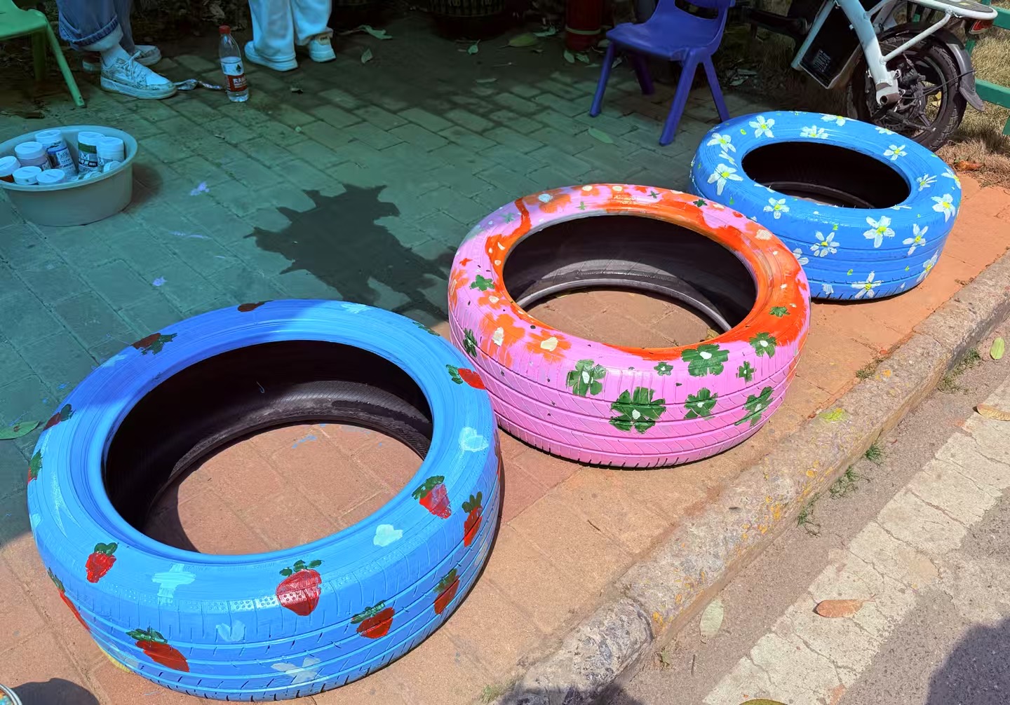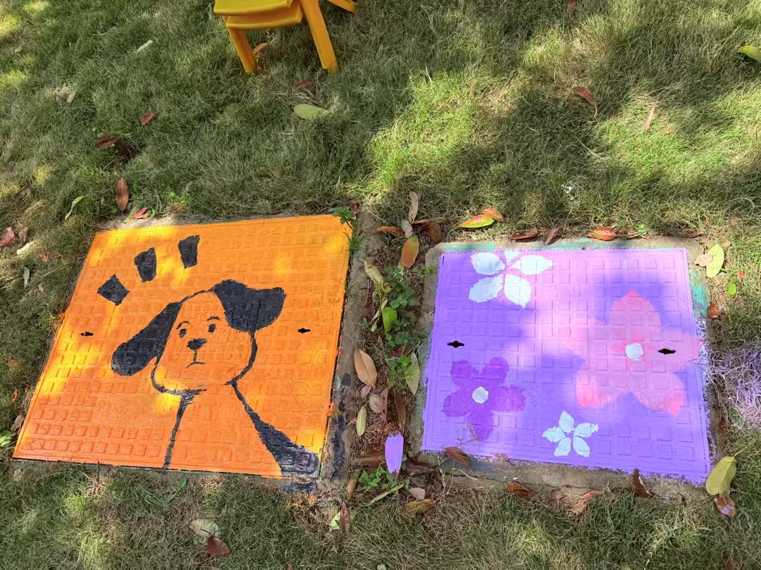 另一组志愿者与孩子们走进社区街道,将原本灰暗的井盖变为传递环保理念的“艺术窗口”。孩子们在志愿者指导下分组协作,以“人与自然共生”为主题绘制井盖。短短三小时,12个井盖变身“生态画廊”,成为社区一道亮丽的风景线。路过的居民纷纷驻足拍照,社区书记称赞:“这些作品让冷硬的设施有了温度,孩子们用艺术唤醒了更多人的环保意识。”
