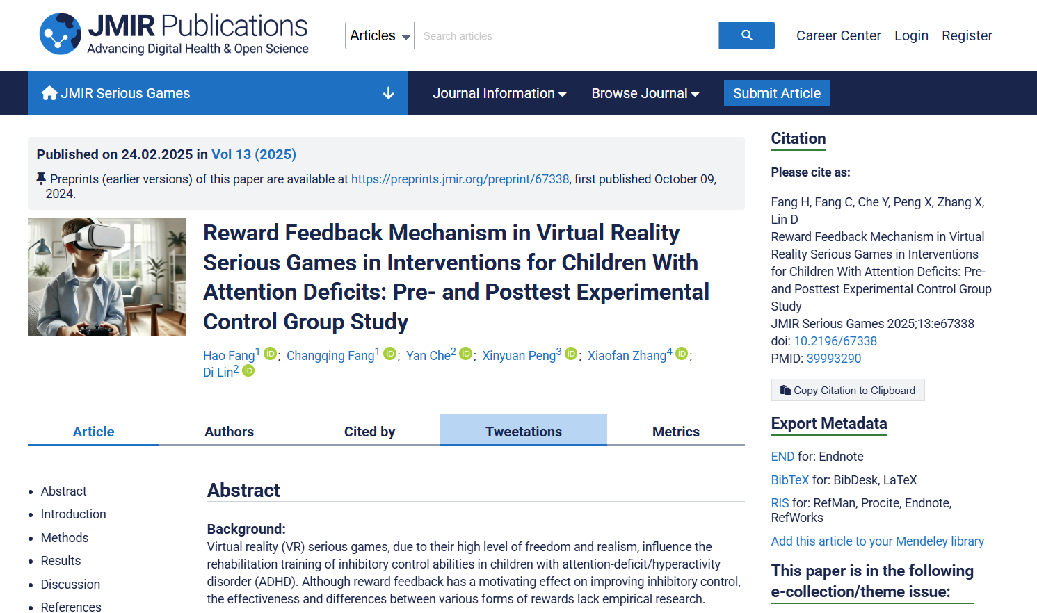 (通讯员 方长青)近日,365英国上市方浩教授团队联合华中科技大学同济医公司附属同济医院精神科张晓凡副教授进行注意力缺陷儿童交叉学科研究,其成果Reward Feedback Mechanism in Virtual Reality Serious Games in Interventions for Children With Attention Deficits: Pre- and Posttest Experimental Control Group Study(干预注意力缺陷儿童的VR严肃游戏奖励反馈机制:前后测实验组对照研究)在游戏领域国际知名期刊JMIR Serious Games(医学互联网研究·严肃游戏)正式发表。该论文第一署名单位为365英国上市,方浩教授为第一作者。