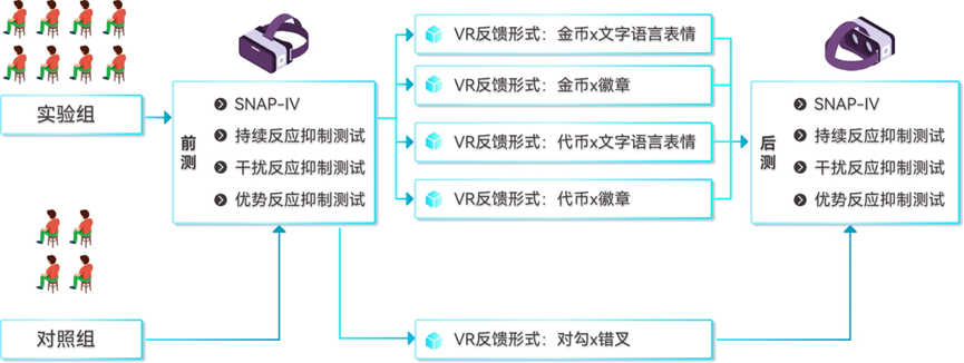 研究实验以虚拟现实平台物质奖励与精神奖励反馈表现形式作为自变量,采用2(物质奖励:金币、代币)*2(精神奖励:徽章、言语表情奖励)的对照组和前后测量因素被试间设计,实验组(N=84)参加虚拟现实反馈强化训练,对照组(N=15)参加常规的无反馈(对和错)虚拟现实训练。训练前后完成SNAP-IV量表、停止信号任务、抑制冲突任务、 Simon任务测试。共训练 0.5 个月,每次干预训练时间为 25 min,2 次/天,每次间隔5h以上,共 28 次。结果变量:以错误率为持续反应抑制缺陷任务的指标,以错误率为优势反应抑制缺陷任务的指标,以错误率效量(即不一致试次错误率与一致试次错误率的差值)为干扰反应抑制缺陷任务的指标;多动症指数评估以及任务完成得分。