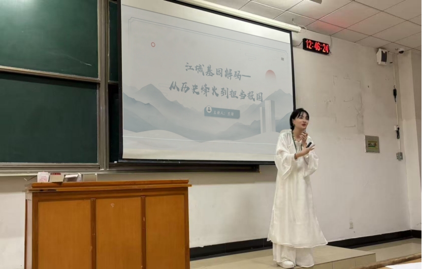 本次思政课的主题为“江城基因解码:从历史烽火到担当报国”。兰洁老师从理论、历史、政治等多个角度向同学们阐述了中国共产党的执政规律和带领中华民族实现民族伟大复兴的历史进程,为同学们科学地分析了坚持中国共产党的领导这一政治优势。