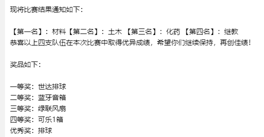 6月17在艺术楼3-7举行了盛大的颁奖典礼,在此感谢所有参赛队员的全力拼搏,你们用汗水诠释了青春的激情。排球场内比赛的哨声虽已停息,但拼搏的精神永不落幕。愿这份热血与执着,继续激励我们在学业与人生的赛场上勇攀高峰。下一届,我们球场再会!(审稿 王超)