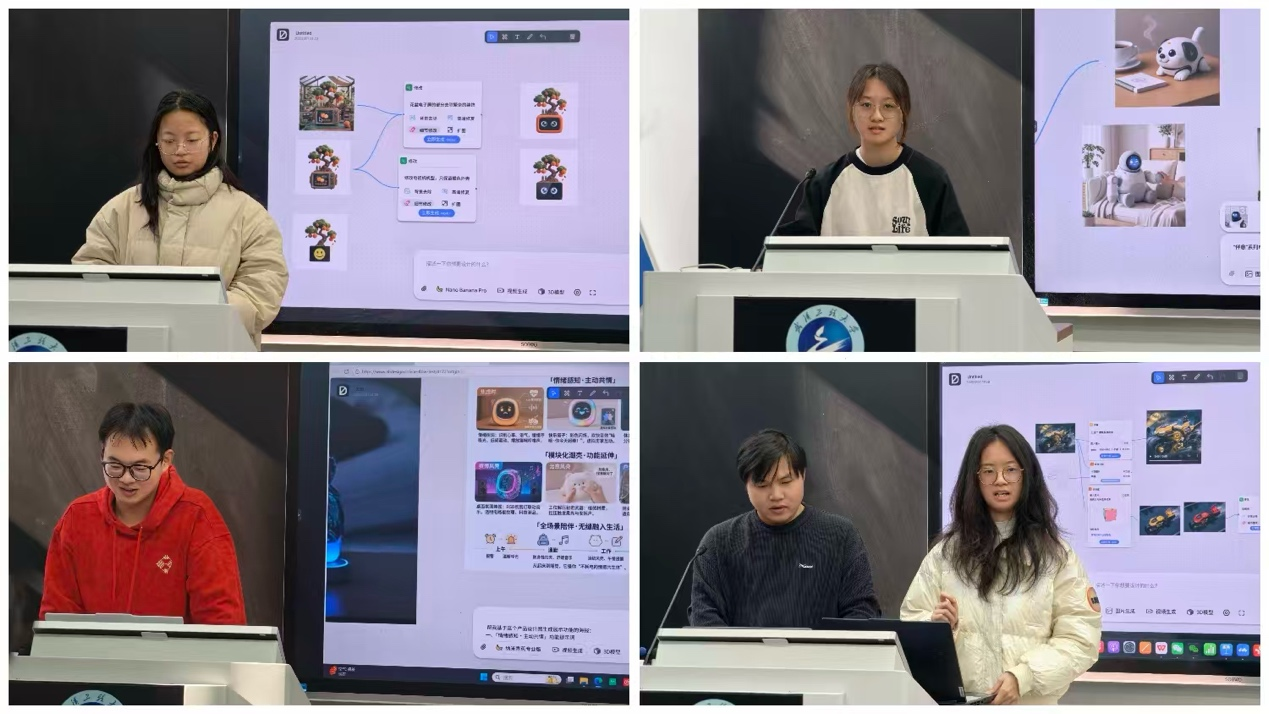 为让员工直观感受AI设计的落地流程,讲座特设实战创作环节。朱德康团队抛出企业真实面试题 ——“设计一款适合年轻人的电子宠物”,引导员工开展限时创作。借助 Degen3 平台的设计调研、头脑风暴与渲染生成功能,员工们快速完成从需求分析到可视化方案的全流程输出并进行成果分享:视觉传达专业同学以“多巴胺风格” 模型,设计出可随用户情绪变换光效的“心情伙伴”,搭配 APP社交联动功能;化工专业同学则结合材料特性,利用参数化建模模块设计出硅胶材质的 “便携陪伴宠物”,兼顾防摔耐用与亲肤触感,呼应了当下AI潮玩从“静态装饰” 到“情感伙伴”的升级趋势,展现了跨学科融合的巧思。朱德康逐一点评时强调:“优秀的 AI 设计既要贴合年轻群体对情感陪伴的需求,更要通过技术工具实现创意与实用性的平衡。”