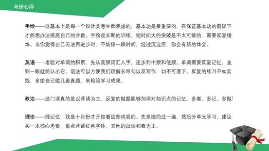 陈婷详细阐述了自己考研的心路历程,着重分享了在专业快题方面需要注意的事项,并为同学们推荐了相关的资料,为想要考研的同学们提供了宝贵的复习经验,希望准备考研的员工在复习时少走弯路。