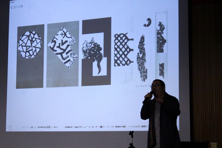 孔森教授首先以他自己近二十年的设计作品开场,讲述平面设计中设计语言的重要性,指出好的作品强调创意与设计意味。随后他以当代一些设计师具有东方传统文化精髓的设计作品为例,剖析了当代审美条件下东方文化内涵在作品中的传达方式,并指出用传统表现行式,以水墨等符号元素为设计语言做设计,既有现代设计简约要求,又能体现中国传统文化精髓。