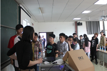 上午10:00,讲座在副经理宋奕勤教授的主持下拉开序幕。薛冰女士首先播放了目前虚拟现实行业(VR)前沿的有关视频,让现场师生了解什么是虚拟现实技术。视频所带来的强悍视觉冲击,让大家兴趣激昂。随后技术人员向大家展示了VR技术的相关硬件设备,并逐一进行讲解。讲座最有趣的环节是让现场师生亲身上台体验虚拟现实技术的奇妙世界,每位同学体验过后都为VR的强大功能惊叹不已。