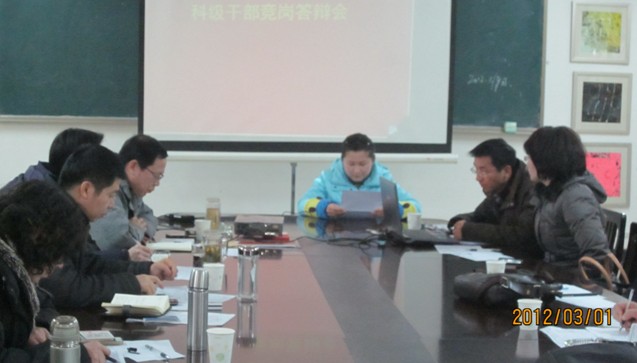 参加了此次竞聘的有张蕾、韩力、魏开红、关媛、穆海梅等五位同志。竞聘的人员分别从个人基本情况、对岗位职责的理解、素质与能力、上岗后的打算等方面作了竞岗报告。竞岗工作领导小组分别进行了提问,竞聘人员现场进行答答辩。