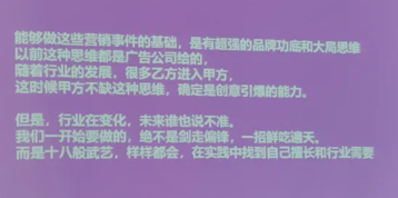本次讲座,赵金勇先生重点分享了综合代理公司。首先以英扬传奇整合营销、不同行业的第一品牌以及湖北本土广告公司为例,向同学们介绍了广告公司的核心构架和常见的网红大事件。之后,侧重分享华帝燃具、美拍手机世锦赛、大堡礁等创意营销案例,阐述研究品牌策略的方法和排期计划“表格化”的习惯。赵先生表示,能够做这些营销事件的基础,需要有超强的品牌功底和大局思维,广告人应该加强观察和思考能力。