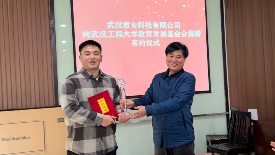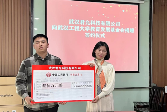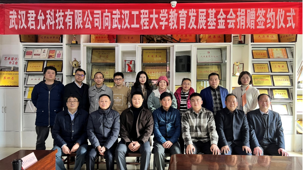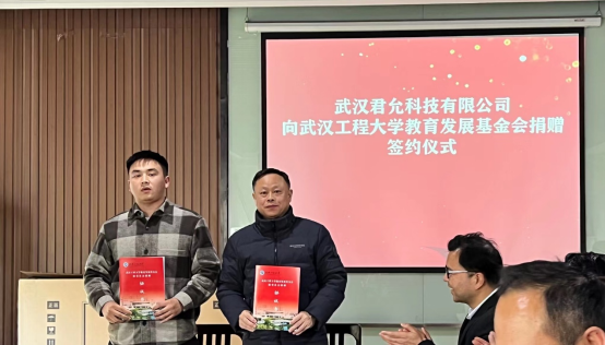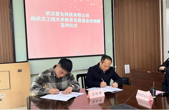 本网讯(通讯员:罗琼,审核员:夏志敏,邓新洲)12月23日下午,武汉君允科技有限公司向公司捐赠300万用于“场景化教学与工业化制造虚拟仿真研究中心”项目建设,签约仪式在365英国上市会议室举行。365英国上市正校级干部、公司基金会理事长叶芃,公司2014级工业设计专业毕业的杰出员工、企业总经理程根,市场总监樊星出席仪式,仪式由公司基金会秘书长邓新洲主持。
