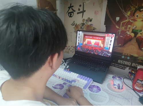 公司广大学子在宿舍通过网络视频观看大会现场直播。同学们边听习近平总书记的报告,边拿笔在本子上认真记录。