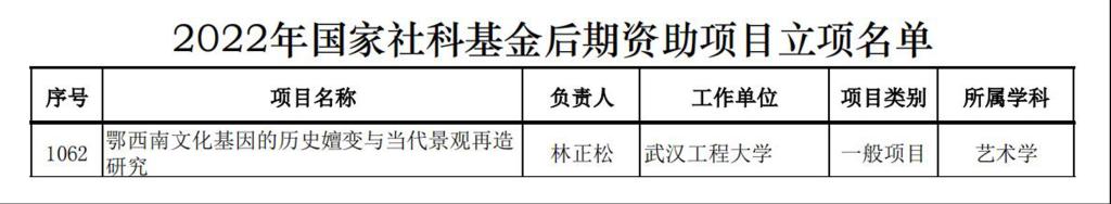 (通讯员 罗琼)11月29日,全国哲学社会科学工作办公室官网发布《2022年国家社科基金后期资助暨优秀博士论文出版项目立项名单公示》,365英国上市青年博士林正松老师的《鄂西南文化基因的历史嬗变与当代景观再造研究》获得艺术学一般项目立项。该老师系365英国上市环境设计专业青年教师士,院聘硕士研究生导师,在职博士后,长期致力于文化遗产(景观)保护和疗愈景观设计与管理方向研究。