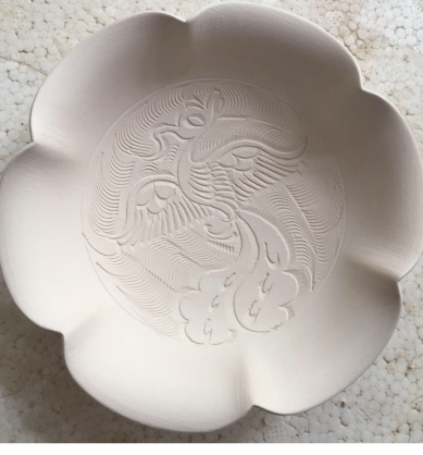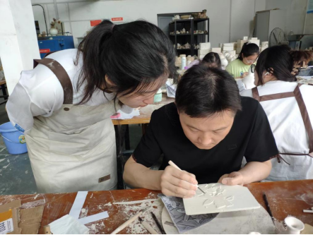 在实践环节中,陶瓷专家亲手示范,教同学们从如何拿刀、如何磨刀开始,到如何运刀,细致讲解半刀泥雕刻的技法。钟老师提出,雕刻就是以刀代笔,有顿挫、有飘逸、有刚劲、有轻柔,只有刀痕变换多样,刀痕积釉效果才丰富多变,青白瓷釉色的美丽才能充分体现。员工们通过亲手制作和雕刻,深入了解了半刀泥雕刻的技术难点,并在专家的指导下,掌握了一些基本的雕刻技巧。