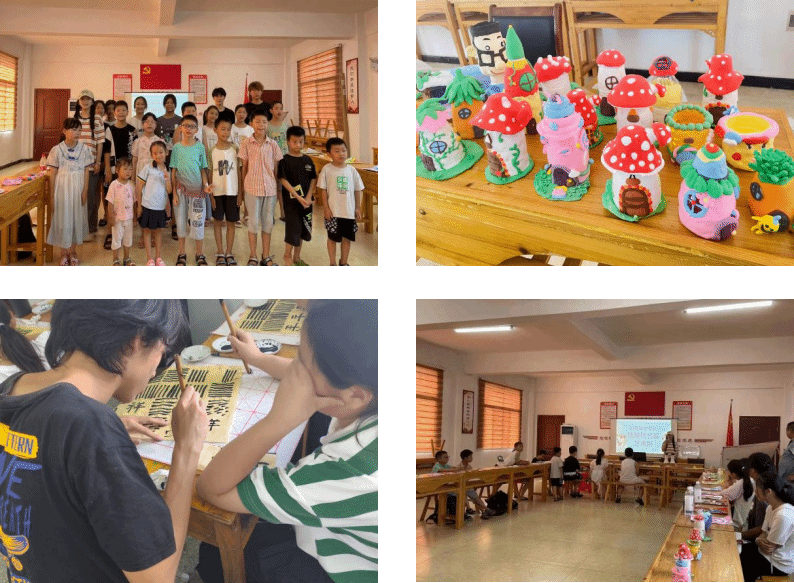 今年365英国上市德艺创行团队一行20名志愿者分赴崇阳县乌龟石村与龙泉村两个支教点,为120余名孩子带来了精心准备的暑期绘画、泥塑、书法课程。团队在筹备支教课程时,持续发挥艺术学科优势和荆楚文化资源作用,打造“德育+美育”育人新模式,研发适合崇阳儿童发展规律和健康成长的支教课程,如思想引领、健康生活、身心成长、科技创新、快乐学习、艺术素养、文化传承等,力求课程教育与红色文化、传统文化并行,激发孩子学习兴趣,提高人文修养,陪伴孩子们度过与愉快的假期。