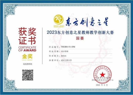 郭庆红老师等编著的教材《设计管理》,以培养员工对设计专业的热爱为目标,将思政教育与专业教育紧密融合,精心构思课程结构,重塑教材内容,理论与案例结合,创新教学方法,教学创新和人才培养成效显著,获得评委专家的一致好评,最终摘得国赛金奖。