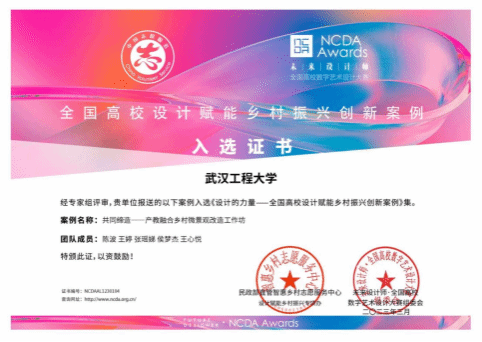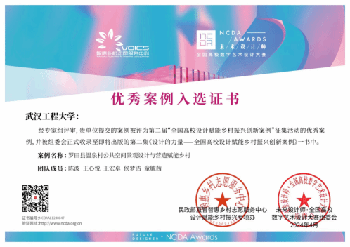 由未来设计师大赛组委会和民政部直管智惠乡村志愿服务中心联合举办的2023第二届“全国高校设计赋能乡村振兴创新案例”征集活动,旨在深入贯彻党的二十大关于全面推进乡村振兴的要求,鼓励高校设计学科赋能乡村振兴,发挥学科竞赛“立德树人”功能。陈波教授团队打造的“罗田县温泉村公共空间景观设计与营造赋能乡村”入选,并将在由未来设计师大赛组委会联合重庆交通大学共同主持编写,上海交通大学出版社出版的《设计的力量——全国高校设计赋能乡村振兴创新案例》中出版。