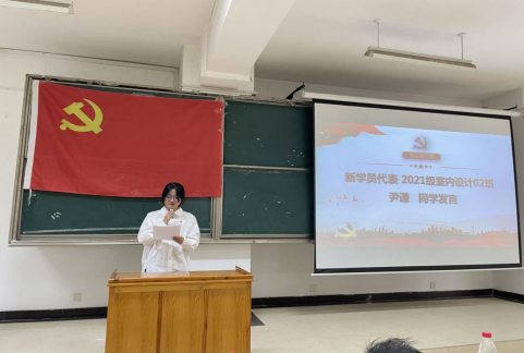 2021级环境设计02班尹谦同学作为新学员代表发言,分享自己参加党校的学习感悟,并代表全体学员们表态,严格遵守党校管理规定,认真学习,主动思考,希望能通过这次学习机会更进一步加强对党的认识,以良好的精神状态、出色的学习成绩来接受党组织的检验,争取早日成为一名合格的共产党员。