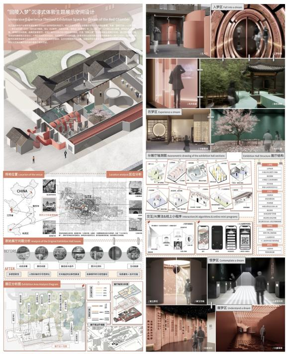 阮棋的作品《“回陵入梦”沉浸式体验主题展示空间》以《红楼梦》故事为载体,通过对书中特定的人物形象、鲜明的空间情境、经典的故事情节三者进行设计元素提取,从而构建出“视听触嗅联觉效应的感官沉浸、空间场域叙事的心理沉浸、正反馈交互的参与式沉浸”三位一体的沉浸式体验主题展示空间。