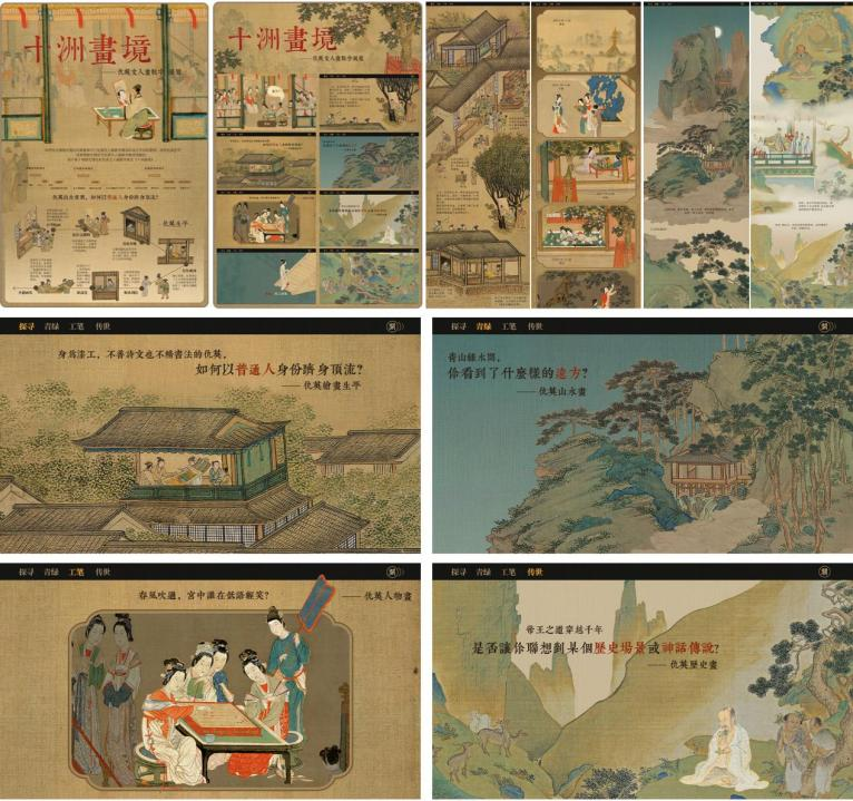 数字艺术方向陈梦媛的作品《十洲画境》则依托情感化设计理论,将明代画家仇英的文人画进行数字化重构,打造了一个融合“视听-互动-叙事”的线上展览空间。导师李月评价:“该作品不仅赋予传统绘画新的生命力,更通过数字技术唤起当代观众的情感共鸣。”