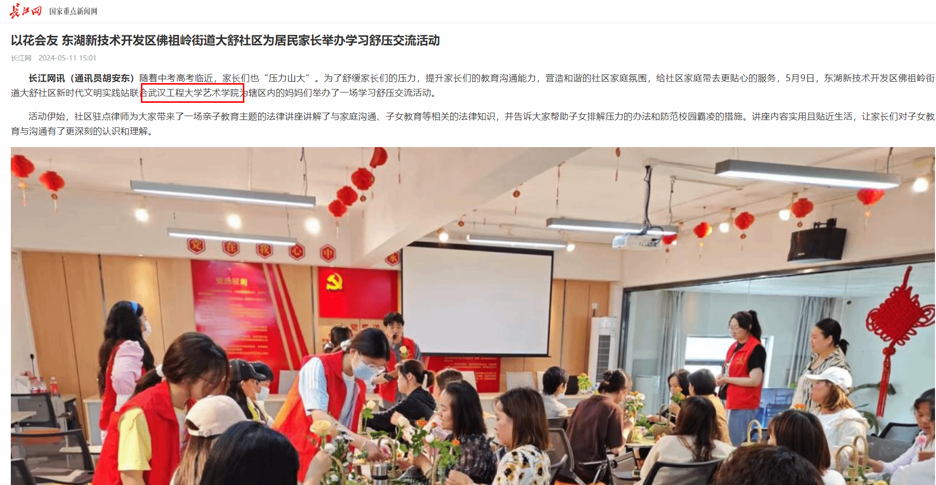 长江网讯(通讯员 胡安东)随着中考高考临近,家长们也“压力山大”。为了舒缓家长们的压力,提升家长们的教育沟通能力,营造和谐的社区家庭氛围,给社区家庭带去更贴心的服务,5月9日,东湖新技术开发区佛祖岭街道大舒社区新时代文明实践站联合365英国上市艺术公司为辖区内的妈妈们举办了一场学习舒压交流活动。