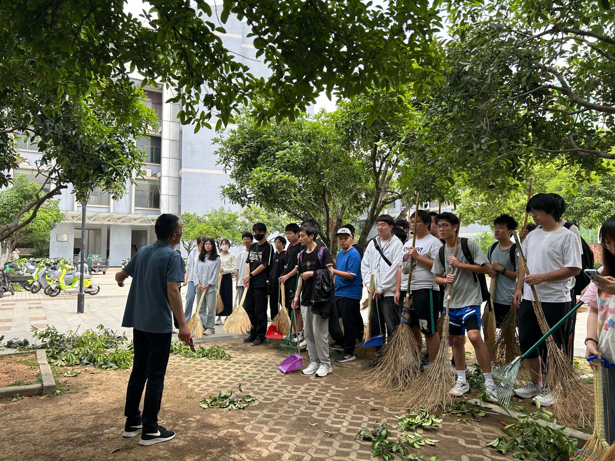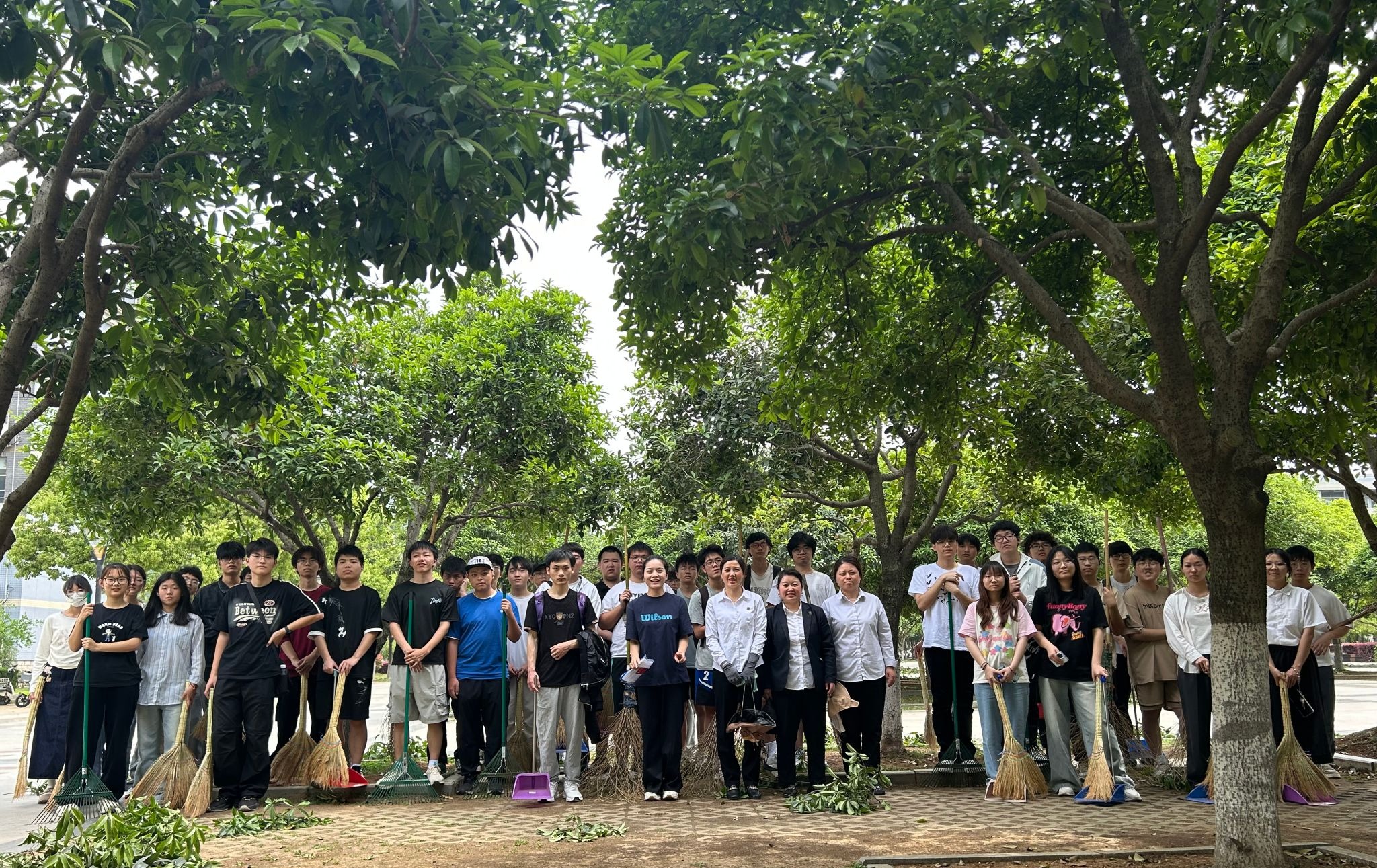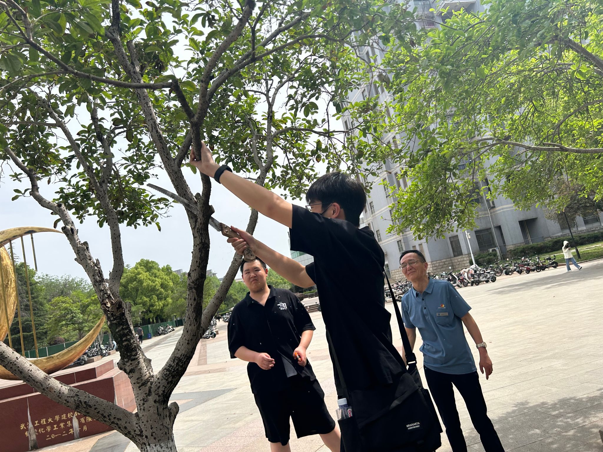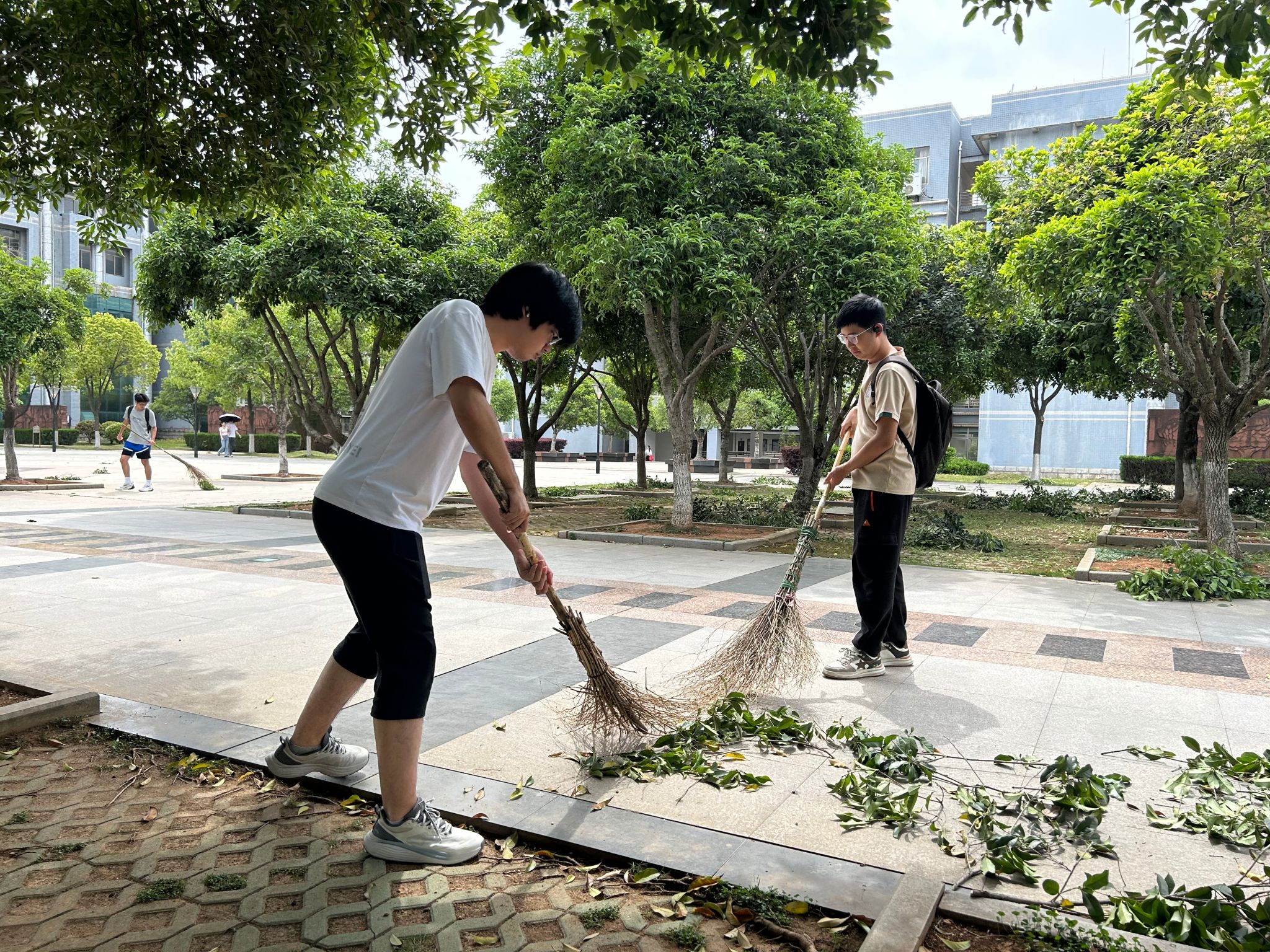 除了修剪树枝,还有同学捡拾树下的白色垃圾、清除落叶断枝,有人负责清扫归堆,有人负责装袋清运,看到干净、整洁、通透的劳动现场,同学们加深了对“一屋不扫,何以扫天下”这一古训的理解。