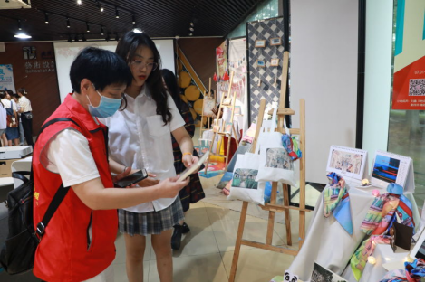 员工向志愿者介绍自己的作品