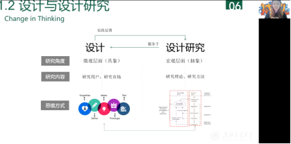 第二位主讲人周芷薇发表了主题为从设计小白到设计研究——科研小白进化史的分享报告,将自己的研究生学习历程分为三个阶段:设计与技术的碰撞、设计到科研的变化、开始理解设计研究,为同学们讲解了设计的科学性、如何做设计研究以及如何完成一篇论文,并分享了自己在研究生学习阶段的一些心得体会,激励同学们做基于中国国情、能解决中国问题的设计研究,并且抱着永远不满足、永远在路上的态度来进行设计研究。
