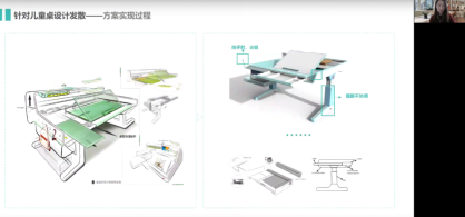 第四位主讲人童紫云发表了主题为灾害应急式学习课桌椅的迭代设计研究的分享报告,介绍了灾害应急课桌椅的设计思路以及设计流程,并分享了自己是如何在设计的过程中不断的反思、不断的发现问题来进行课桌椅的迭代设计。