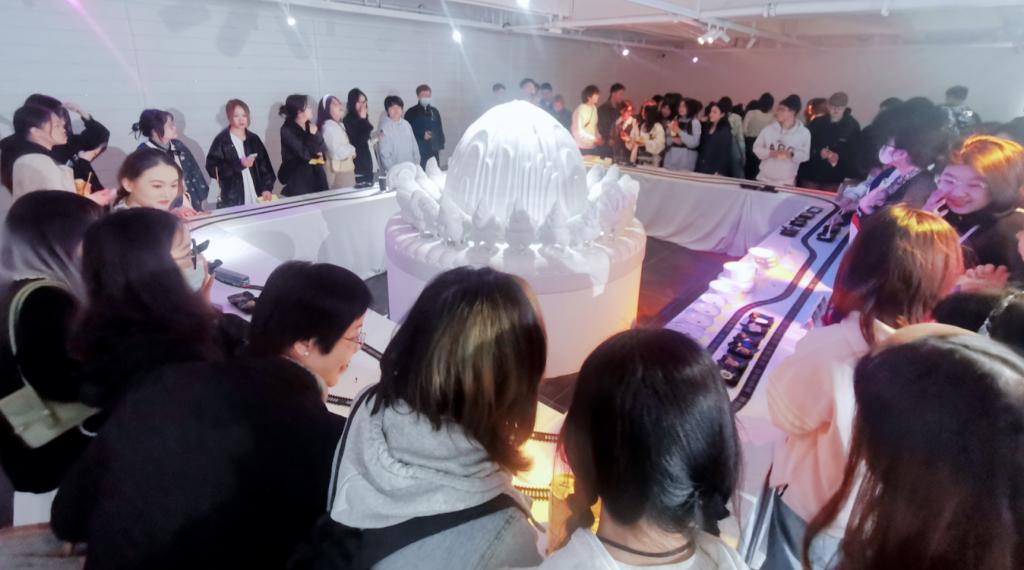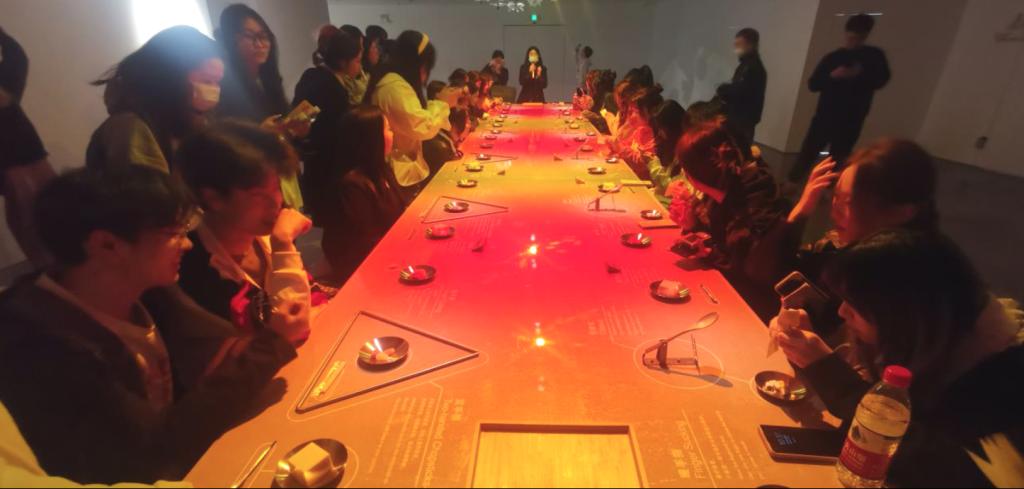 首先师生们一起参观体验了《EAT ART·邂逅》展览,这是一个动态食物链装置,现场搭建了各种不同风格的建筑景观,并创造性地提出了“吃掉一部艺术史”的概念。将东西方艺术史和湖北特色美食相结合,研发了“粉蒸千里江山”、“兰亭鱼糕”、“睡莲藕粉”、“波洛克豆皮”、“红黄蓝蛋糕”、“这不是一个面窝”等12道创意艺术料理。将传统饮食文化与现代科技艺术相结合,概念新颖。