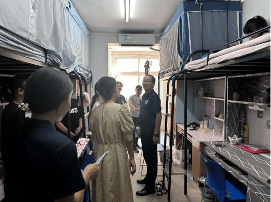 校领导们关心同学们的安全并叮嘱新生应该养成好习惯,注意个人财产安全,提醒同学们要加强防范宿舍安全意识,个人安全是学习发展的前提和保障。