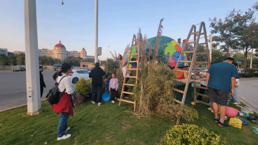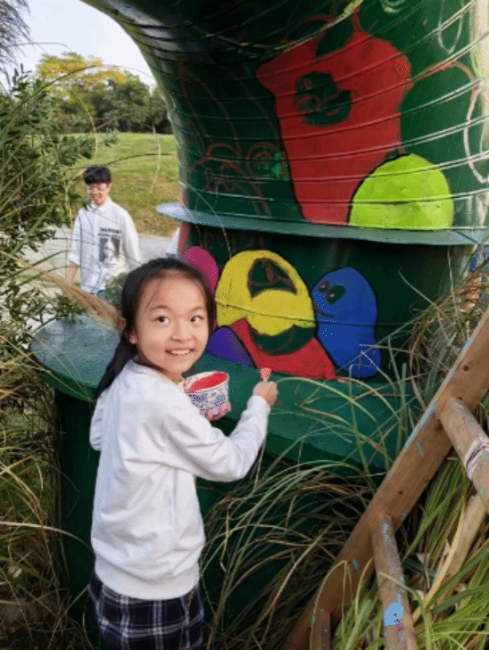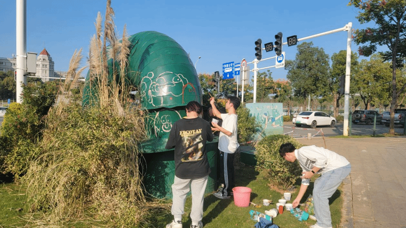 参与了墙体彩绘的余乐同学表示,“我第一次在城市公共设施上作画,这个管道造型十分复杂,而且表面温度很高,这很考验团队合作力。每个人选好色号、拿好刷子涂画对应的分工部分,看似非常简单,但由于管道表面温度很高,导致涂色很不容易,分工的区域我涂了将近半天,最终的成果使我特别有成就感!”