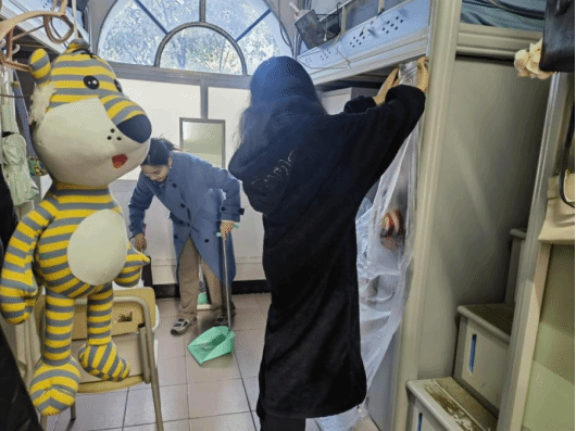 师生们投入到整理宿舍内务和打扫清洁的工作中。大家齐心协力,不放过任何一个细节,清理垃圾、拖地、整理床铺等,每个人都发挥自己的力量。在师生的共同努力下,宿舍焕然一新,呈现出整洁、舒适的新面貌。