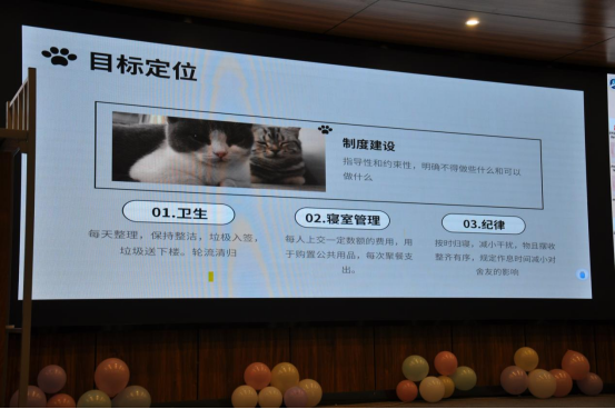 经过初评评选,有20间寝室进入决赛,同学们通过精心准备的PPT,展现其布置精美的、与众不同的宿舍环境,营造出家一般的感觉。在宿舍风采展示环节,同学们通过文字、图片、视频等形式,生动向在场的评委和观众们展现了宿舍的独特魅力、舍友之间的深厚情谊,以及宿舍和谐友善,积极向上的氛围。