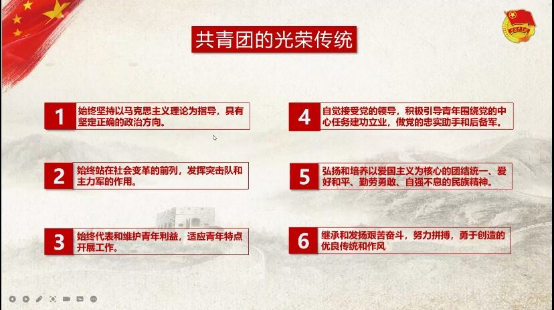 本次授课内容主要围绕五个方面来进行:走进共青团、共青团的基本工作与职能、网络共青团、新时代新青年、共青团工作的高效方法。