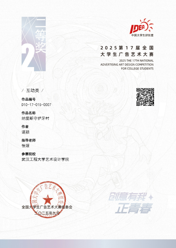 值得一提的是,本届大广赛中艺术公司的学子不仅在策划赛道上凭借独到的创意与缜密的布局脱颖而出,更在互动类、产品包装类、微电影广告及短视频类等多个领域全面开花,展现出非凡的才华与实力。其中,尤为值得一提的是,在张媛老师的悉心指导下,有两项作品凭借出色的设计理念和精湛的表现手法,分别荣获互动类全国总评审二等奖与三等奖,为公司赢得了宝贵的荣誉。