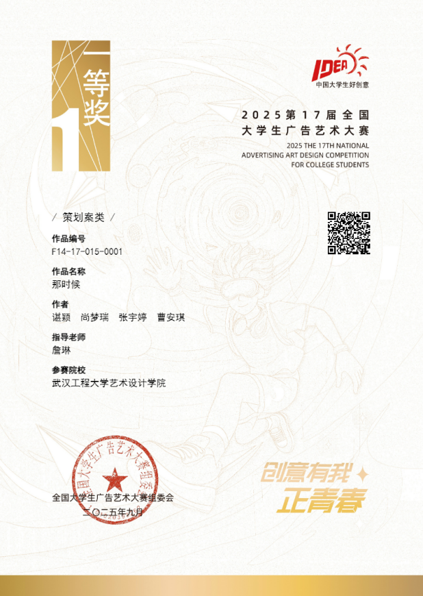 谌颖、尚梦瑞、张宇婷、曹安琪四位同学创作的《那时候》作品,以其独特的创意和精湛的执行力,赢得了评委的高度认可。作品契合了当代人对情感沟通的深度需求,以那时候为情感桥梁,唤起记忆深处的美好回忆,展现了视觉传达专业员工扎实的专业功底和敏锐的市场洞察力。