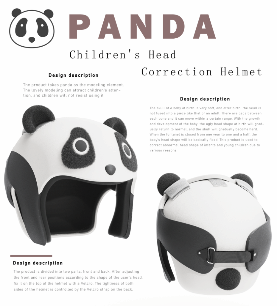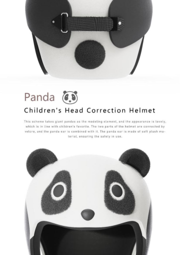 设计过程中,团队深入了解婴幼儿头形畸形问题产生的原因和解决方法,并通过大量的市场调研和用户反馈,进一步完善产品设计方案。考虑到婴幼儿头骨柔软和发育的特点,设计内部采用柔软材质,可根据使用者的头型进行调整和固定。头盔两侧的松紧度可通过背面的尼龙搭扣带进行调整,确保了舒适性和稳定性。这种独特的设计和科学的结构使其在解决婴儿头形畸形问题方面具有很强的优势。同时,它还可以预防和减少头部外伤的发生,为婴儿的健康成长提供了重要的保障。头盔的熊猫造型设计灵感源自中国国宝——大熊猫,其可爱的外貌和形象深受儿童喜爱,能够吸引孩子们的注意力,降低婴幼儿使用时的抗拒心理,从而更好地实现头部畸形的矫正目的。