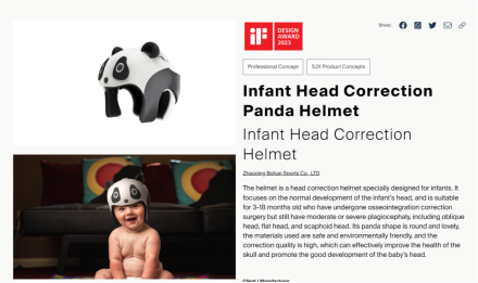 设计作品《Infant Head Correction Panda Helmet》荣获IF产品设计奖,既是设计师与公司的荣誉,更是为解决婴儿头形畸形问题和促进婴儿健康成长的贡献。《Infant Head Correction Panda Helmet》的问世,为婴幼儿头形畸形问题的解决提供了全新的方案和工具。它不仅是一款科技创新和人性化设计的产品,更是一个关注婴幼儿健康成长和家庭幸福的重要举措。相信在不久的将来,《Infant Head Correction Panda Helmet》将会得到广泛应用,为更多的家庭带来健康和幸福。