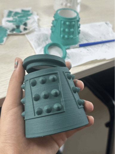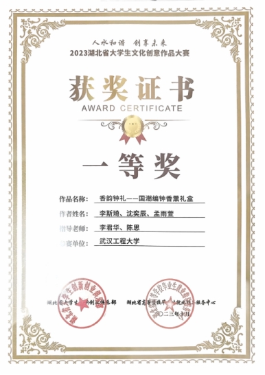 该作品“香韵钟礼”属于李君华教授《产品设计与传统文化》的课程作业。经过公司初赛,省级复赛,成为唯一一支进入决赛的作品。在整个制作过程中,李斯琦团队首先以湖北省博物馆的曾侯乙编钟为灵感来源,然后将香薰与曾侯乙编钟的外观结合,形成了一款时尚和受年轻人喜爱的文创产品,最后经过团队成员的密切合作完成了产品的效果图、海报和实物的样品制作。